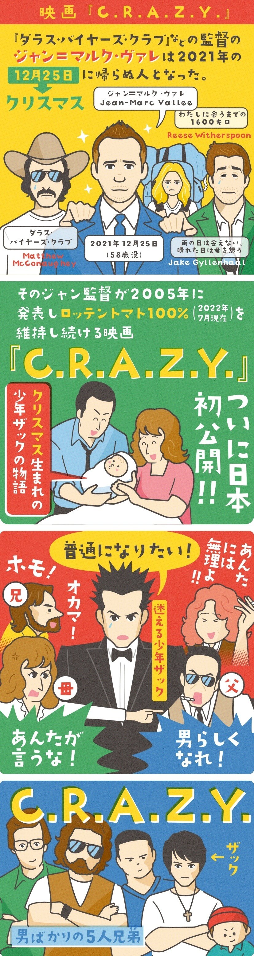 C.R.A.Z.Y. 上映日:2022年07月29日製作国:カナダモロッコ上映時間:129分 監督 ジャン=マルク・ヴァレ 脚本 フランコイズ・ボウレイ ジャン=マルク・ヴァレ 出演者 ミシェル・コテ マルク=アンドレ・グロンダン ダニエル・プロル マイケル・ゴードン